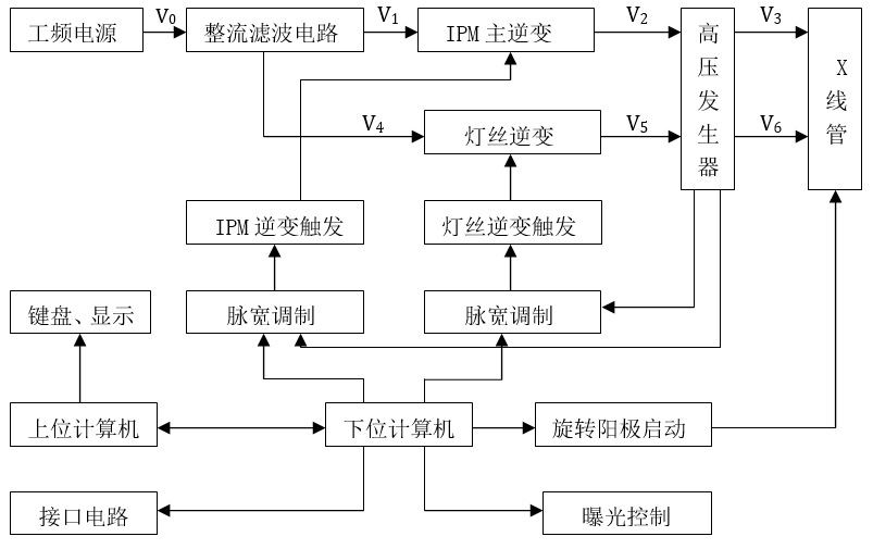 如图3-2所示,工频电源电压Vo经过整流、滤波后变为500V左右的直流电压V1,此电压经主逆变电路后成为几十千赫(kHz)的高频电压V2,该高频电压送高压变压器的高压变压器初级,经高压变压器升压后,将次级所获交流高频电压再经倍压整理变程恒直流高压V3,为X线管提供管电压。管电压的控制采用脉宽调制(pulse width modulation,PWM)方式。在曝光过程中,管电压采样信号与设定值实时进行比较,产生的误差电压经脉宽调制后控制逆变桥的导通时间,确保管电压实际值等于设定值。