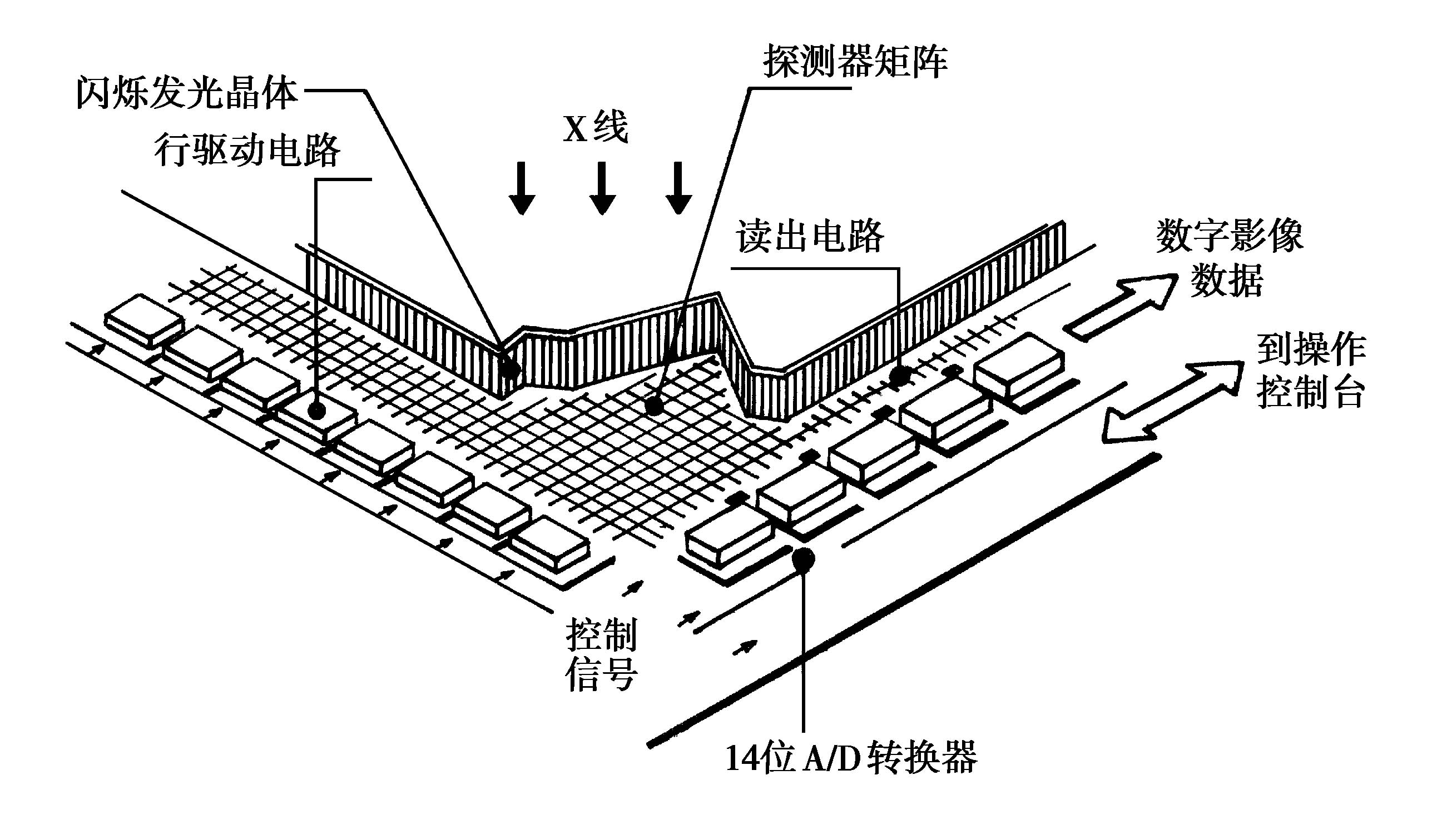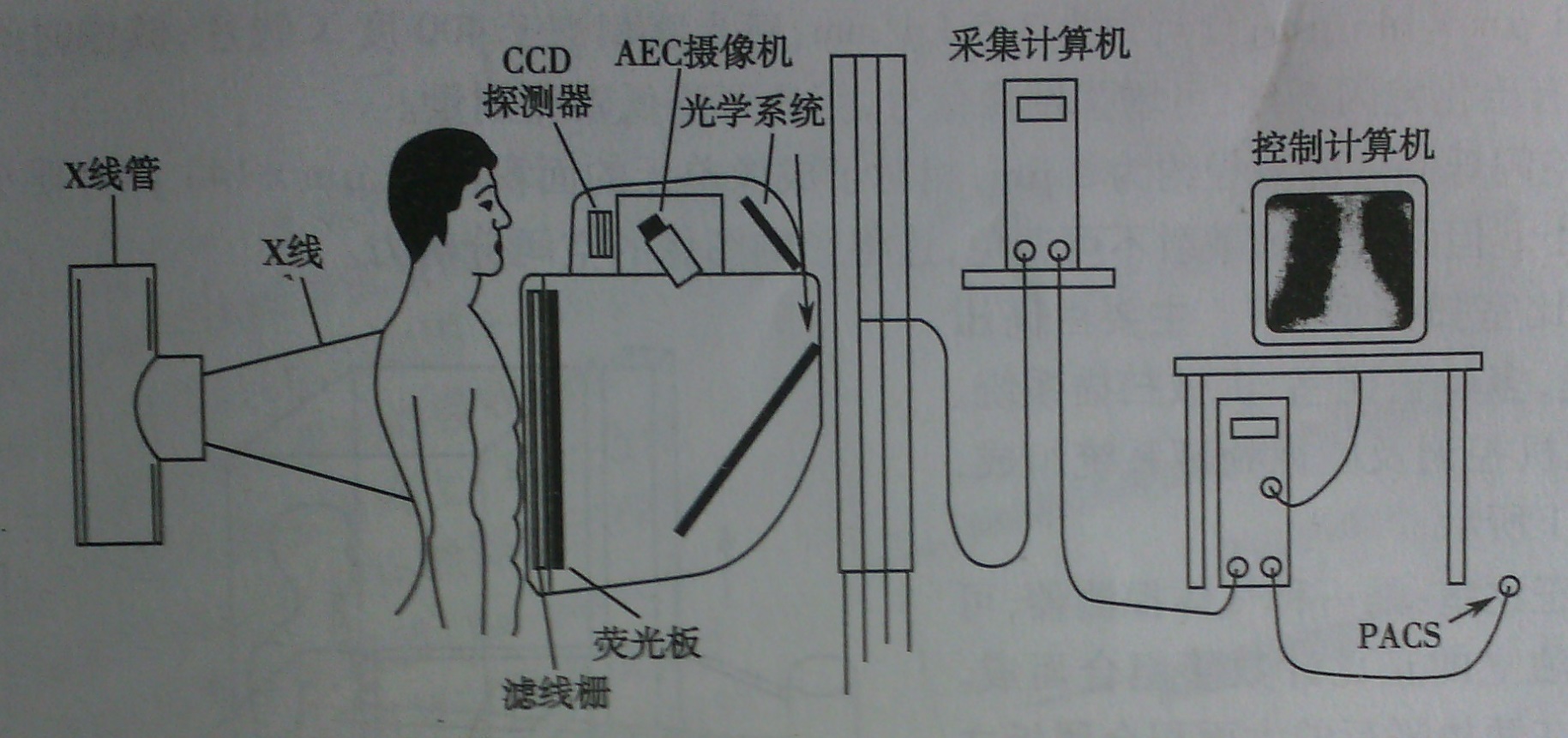 (1)工作原理:X线透过人体被检部位后,经滤线栅滤除散射线到达荧光板,由荧光板将X线图像转换成荧光图像,荧光经过一组透镜反射,进入CCD摄像机光敏区,由CCD摄像机将荧光图像转换成数字图像信号,送图像处理器进行图像后处理、存储,由显示器显示或激光相机打印。