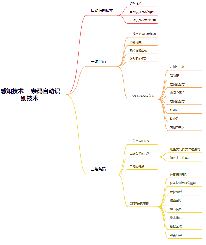 项目二 感知技术--条码自动识别技术----主要知识点分布的思维导图如下: