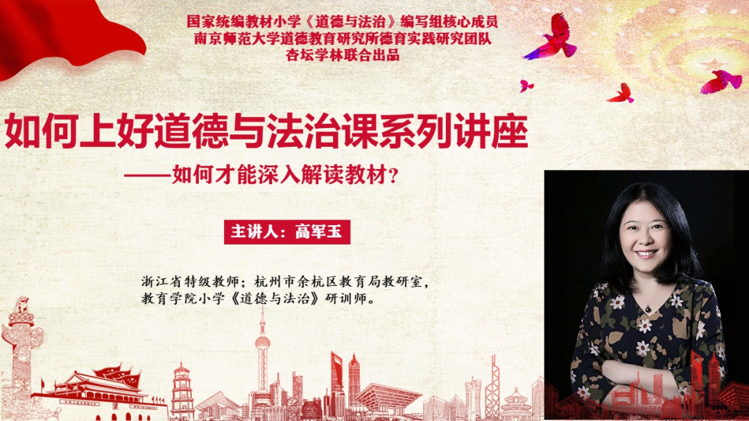 2020年5月10日,浙江省特级教师、杭州市余杭区教育局教研室和教育学院小学《道德与法治》研训师高军玉从“深入解读教材的目的和意义、深入解读教材的方法和路径、深入解读教材需要更新观念”三方面为大家带来了系列讲座的第二讲——如何才能深入解读教材?