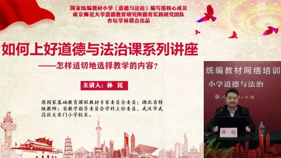 2020年5月24日,原国家基础教育课程教材专家委员会委员、湖北省特级教师、省教学指导委员会学科主任委员、武汉市武昌区大东门小学校长孙民从“用教材‘教’而不是‘教’教材;执教课时内容的划分与选择;合理的教材内容取舍;教学资源的科学拓展”四方面为大家带来了系列讲座的第四讲——怎样适切地选择教学的内容?