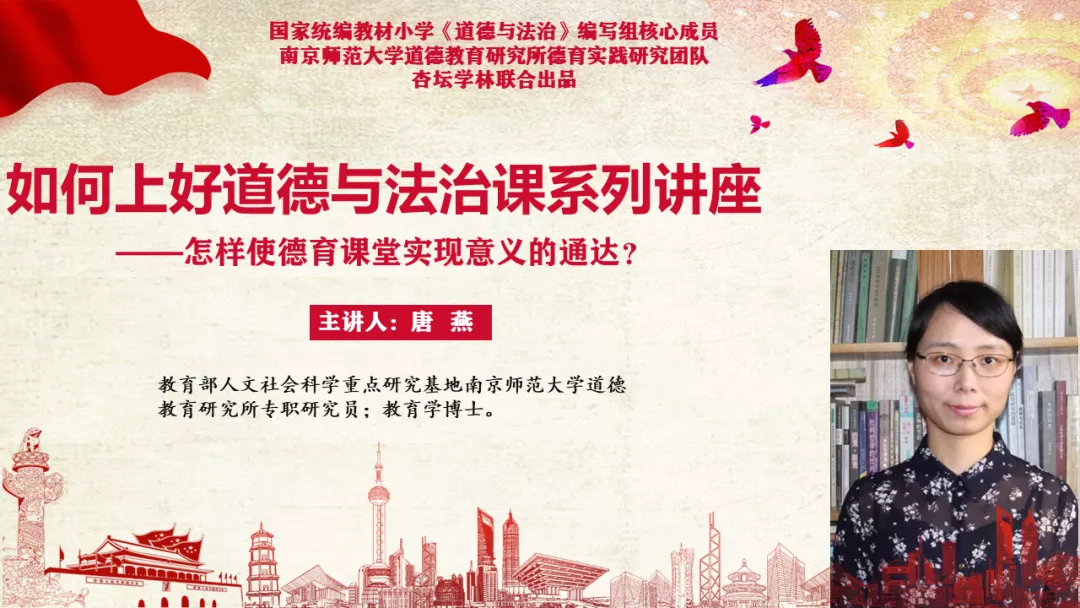 2020年6月7日,教育部人文社会科学重点研究基地南京师范大学道德教育研究所专职研究员,教育学博士,教育部统编小学《道德与法治》中年段教材核心作者唐燕从“课堂教学中的儿童经验观反思;教学设计从现实生活经验出发了吗;考虑可能的生活经验了吗;如何让生活经验通达意义”四方面为大家带来了系列讲座的第六讲——怎样使德育课堂实现意义的通达?