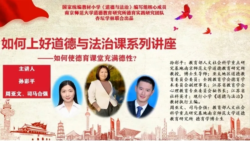 2020年6月14日,教育部人文社会科学重点研究基地南京师范大学道德教育研究所教授、博士生导师、现行小学《道德与法治》教材执行主编孙彩平,南京师范大学道德教育研究所德育学博士生周亚文、司马合强从“课堂本身可以有德性?德育课堂要追求哪些德性?如何使德育课堂不失德?”三方面为大家带来了系列讲座的第七讲——如何使德育课堂充满德性?
