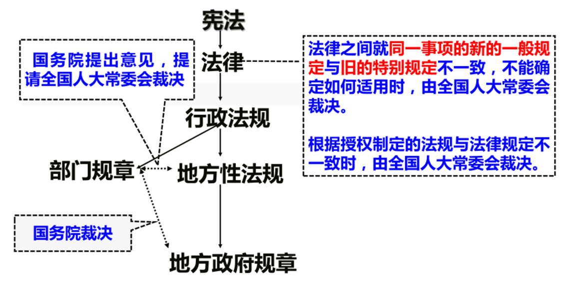法律之间对同一事项的新的一般规定与旧的特别规定不一致,不能确定如何适用时,由全国人民代表大会常务委员会裁决。 行政法规之间对同一事项的新的一般规定与旧的特别规定不一致,不能确定如何适用时,由国务院裁决。