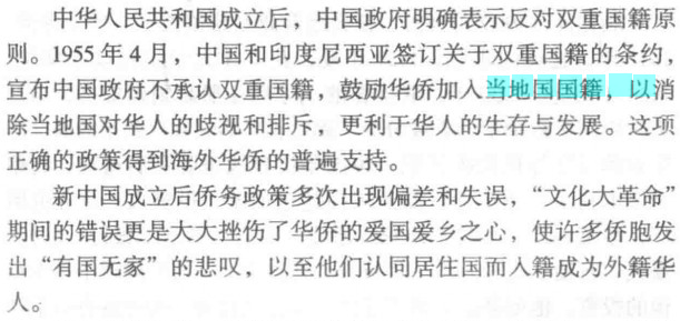中华人民共和国成立后,中国政府明确表示反对双重国籍则。1955年4月,中国和印度尼西亚签订关于双重国籍的条宣布中国政府不承认双重国籍,鼓励华侨加入当地国国籍,以除当地国对华人的歧视和排斤,更利于华人的生存与发展。这正确的政策得到海外华侨的普遍支持。【错乱?】新中国成立后侨务政策多次出现偏差和失误,“文化大革期间的错误更是大大挫伤了华侨的爱国爱乡之心,使许多侨胞出“有国无家”的悲叹籍成为外人。