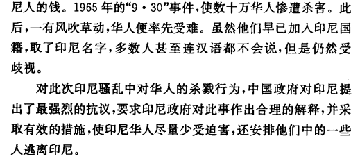 印尼排华事件:印度尼西亚是世界上最大的穆斯林国家,也是海外华人最多的国家。华人在印尼2亿人口中所占的比例不足5%,但他们以其勤劳和善于经营而在国家经济中占有举足轻重的地位,被当地人称为“经济怪物”。由此造成一种误解,认为华人赚了印尼人的钱。1965年的“9·30”事件,使数十万华人惨遭杀害。此后,一有风吹草动,华人便率先受难。虽然他们早已加人印尼国籍,取了印尼名字,多数人甚至连汉语都不会说,但是仍然受歧视。
