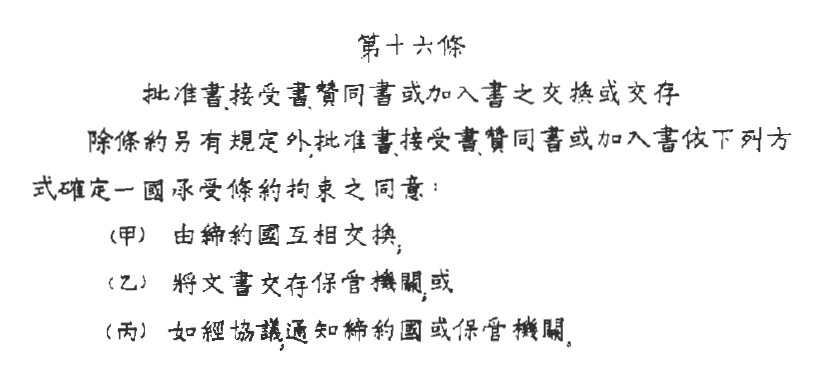 而(四)通知、交换或交存批准书为大多数情况。其英文是:Article 16 Exchange or deposit of instruments of ratification, acceptance, approval or accession《公约》第16条交换或交存批准书、接受书、核准书或加入书。