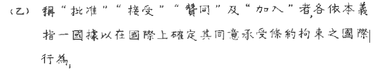 (b) “ratification”, “acceptance”, “approval” and “accession” mean in each case the international act so named whereby a State establishes on the international plane its consent to be bound by a treaty; 【可能更好的翻译:批准、接受、核准、加入】【approval现在不宜翻译成为“赞同”而应该是“核准”,条约的解释理论?上下文?主观论】