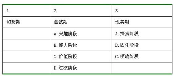 也可分为3个时期。试验期(15--17岁):综合认识和考虑自己的兴趣、能力与职业社会价值、就业机会,开始进行择业尝试。过渡期(18--21岁):正式进入职业,或者进行专门的职业培训,明确某种职业倾向。尝试期(22--24岁):选定工作领域,开始从事某种职业,对职业发展目标的可行性进行实验。