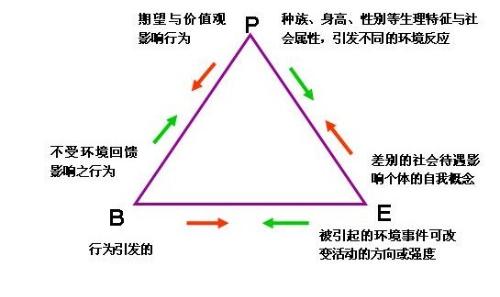 环境决定论认为行为(B)是由作用于有机体的环境刺激(E)决定的 即B=f(E);个人决定论认为环境取决于个体如何对其发生作用,即E=f(B);班杜拉则认为行为、环境与个体的认知(P)之间的影响是相互的,但他同时反驳了“单向的相互作用”即行为是个体变量与环境变量的函数,即B=f(P,E),认为行为本身是个体认知与环境相互作用的一种副产品,即B:f(P*E)。班杜拉指出,行为、个体(主要指认知和其他个人的因素)和环境是“你中有我。我中有你”的,不能把某一个因素放在比其他因索重要的位置,尽管在有些情境中,某一个因索可能起支配作用。他把这种观点称为“交互决定论”。