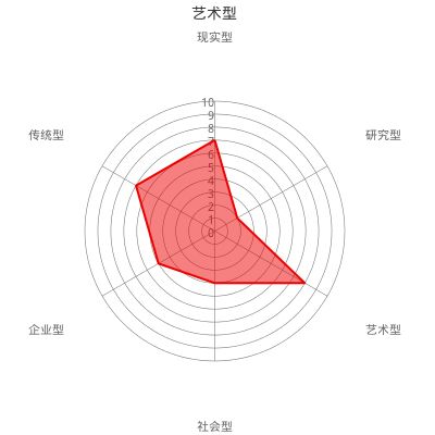 艺术型(Artistic):其本的人格倾向是,具有想象、冲动、直觉、无秩序、情绪化、理想化、有创意、不重实际等人格特征。喜欢艺术性质的职业和环境,不善于事务工作。其典型的职业包括艺术方面的(如演员、导演、艺术设计师、雕刻家等)、音乐方面的(如歌唱家、作曲家、乐队指挥等)与文学方面的(如诗人、小说家、剧作家等).