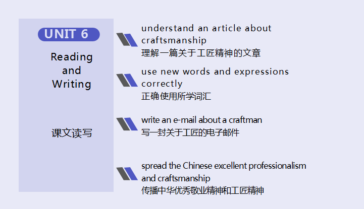 • 重点:学习运用叙述故事发展的句型,以及表述故事寓意的句型,就古代工匠故事进行简单写作。