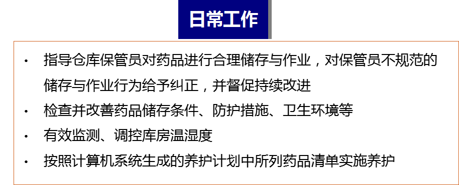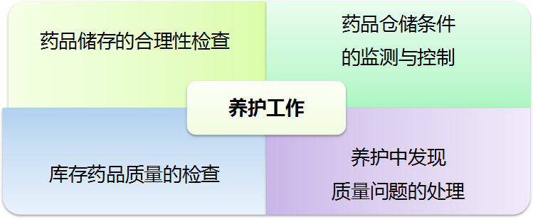 养护员日常巡查:在库药品的分类储存、货垛码放、垛位间距等。