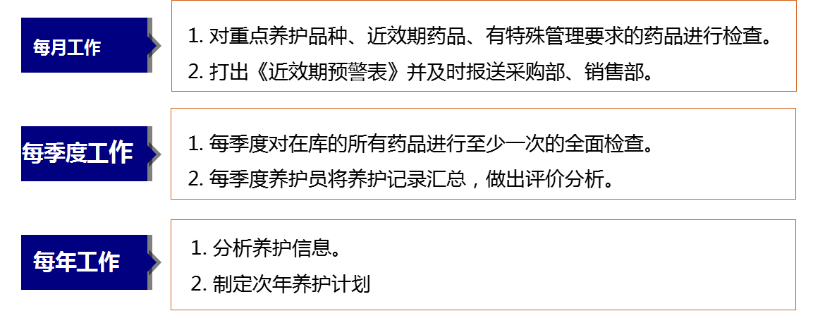 企业计算机系统依据质量管理基础数据和养护制度,对库存药品定期自动生成养护计划。突出主营品种、量大品种、药品监督管理部门近期重点监测的品种和质量易变化的药品。