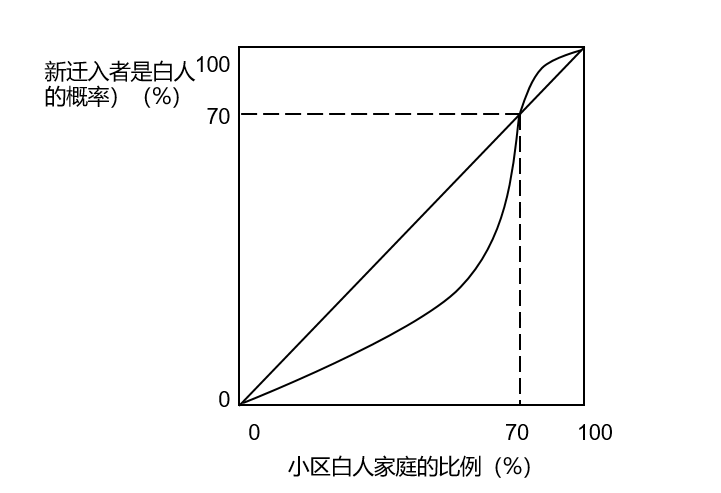 诺贝尔经济学奖获得者托马斯·谢林认为:假如一个地方的黑人居民的比例超过一个临界水平,这个比例很快就会上升到接近100%;假如这一比例跌破一个临界水平,这里很快就会变成白人社区。