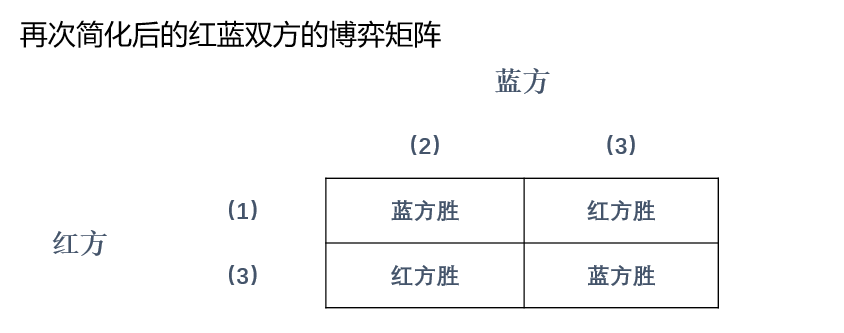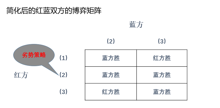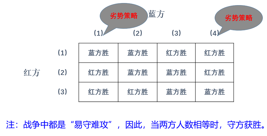 此时,红蓝两方的形势相同,即红方尽管在总兵力上劣于蓝方,但实际上只要运用谋略,攻其不备,其获胜的几率是相同的。在博弈论中,“以弱胜强”的道理就是这样。