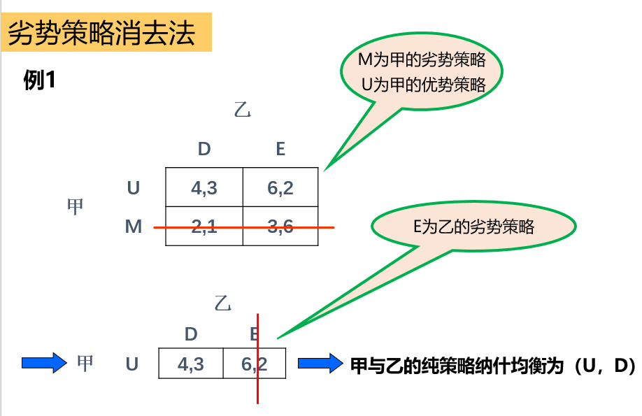 注意:界定一个策略是否是劣势策略,只需要证明它比另一种策略,而不是其它所有的策略给他带来的收益小。也就是说,对整体而言,一个博弈中只可能存在一个优势策略,其它都是严格劣势策略。
