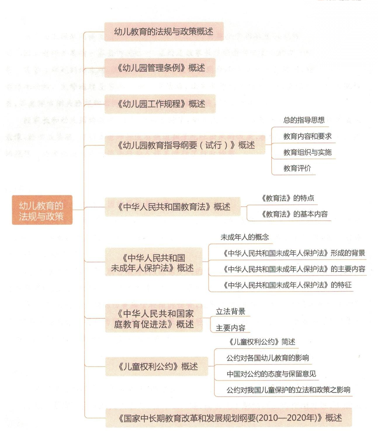 主要内容:掌握《中华人民共和国未成年人保护法》;掌握《中华人民共和国家庭教育促进法》;了解《儿童权利公约》;了解《国家中长期教育改革和发展规划纲要(2010-2020年)》。