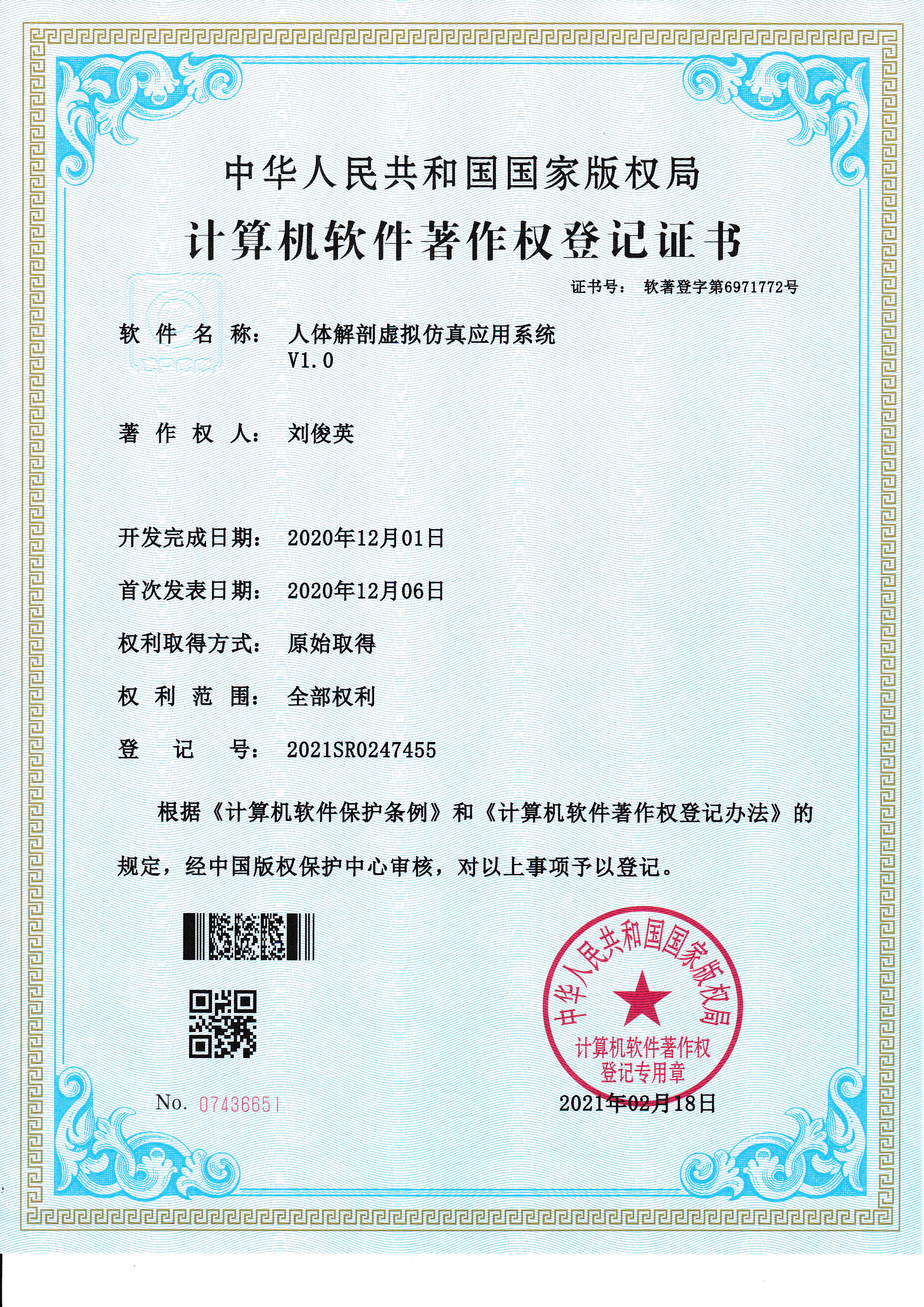 10 | 人体解剖虚拟仿真应用系统V1.0 | 2020年12月1日 | 2021SR0247455 |