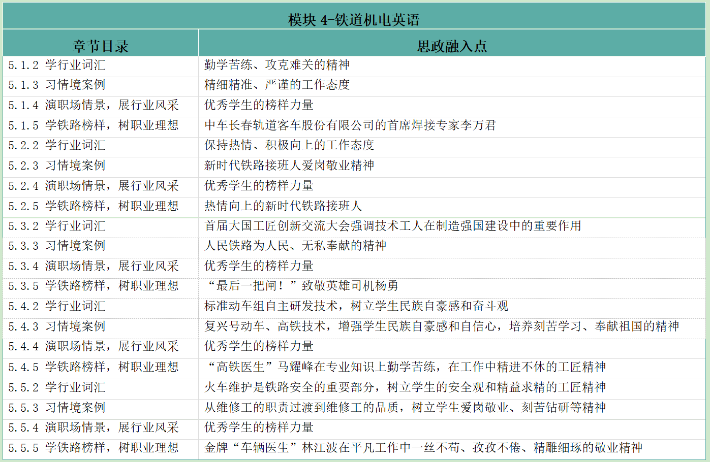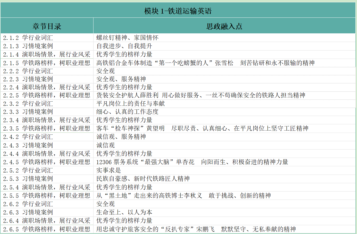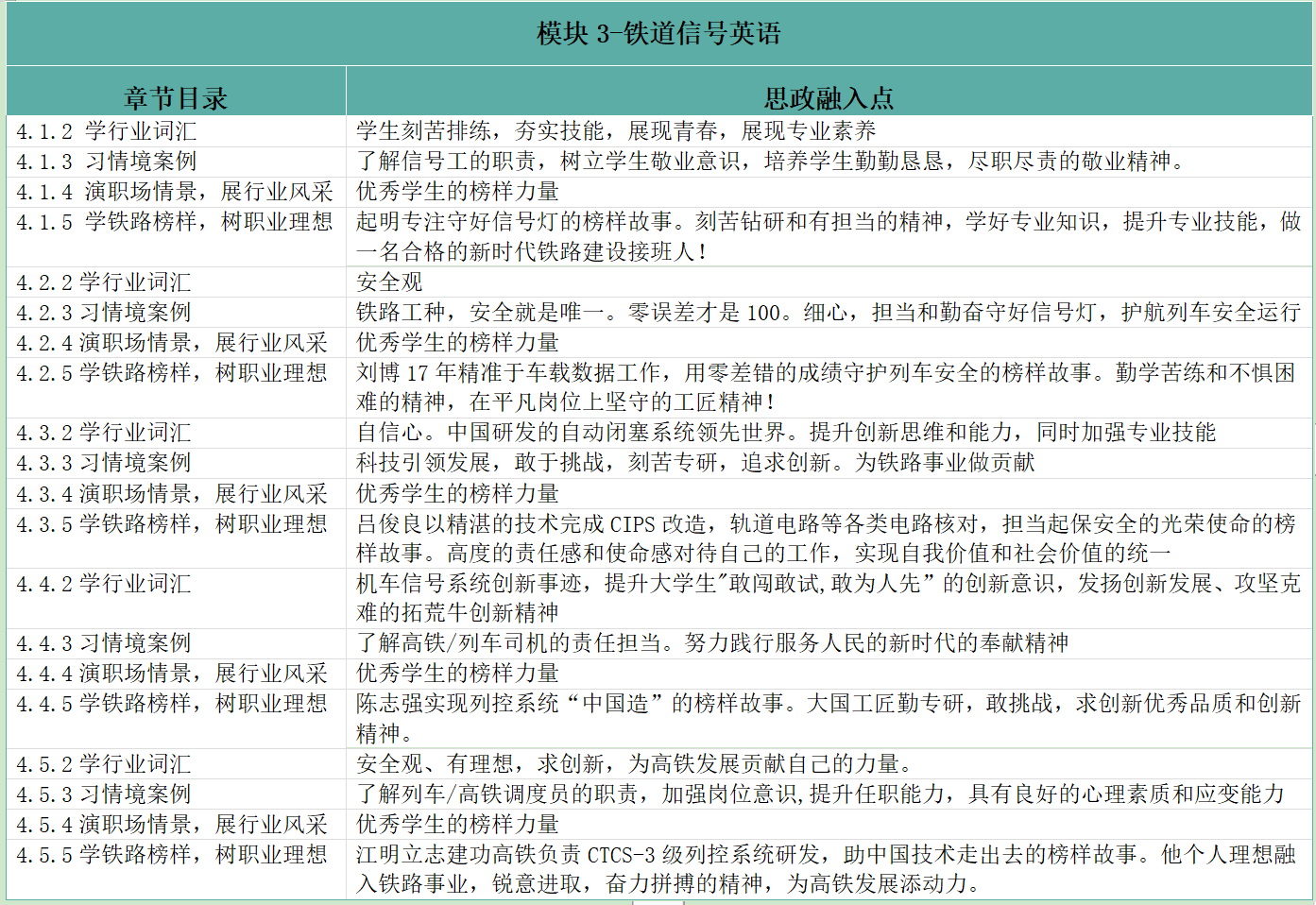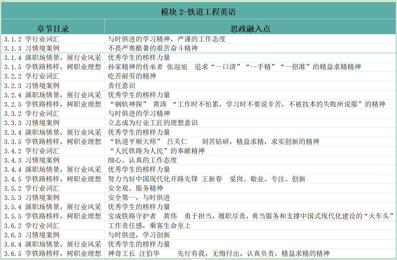 本课程加强语言应用能力培养的同时,落实立德树人,德技并修!在“学行业词汇”和“习情境案例”栏目的知识点讲解中融入螺丝钉精神、岗位责任感、自我进步、精益求精的工作态度、担当意识等育人元素,注重学生的职业素养与人生价值塑造。在“演职场情景,展行业风采”栏目,展示优秀学生示范视频和优秀行业英语手抄报,引导学生以模范为镜,向优秀看齐,以模范标准要求自己,争当示范!在“学铁路榜样|树职业理想”栏目,分享铁路榜样故事,传递榜样力量,塑造职业品质,树立职业理想。(具体思政元素融入详见下表)