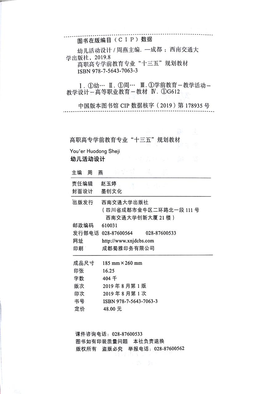 同步教材:《幼儿活动设计》(ISBN 978-7-5643-7063-3)