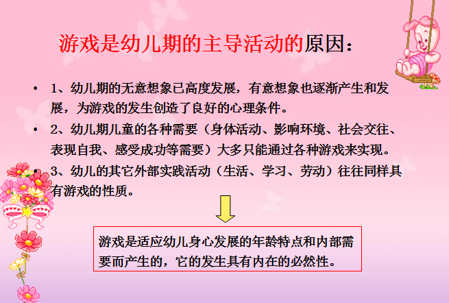 2. 幼儿期,孩子的各种需要(如身体活动、影响环境、社会交往、表现自我等)变得十分明显和强烈,加之他们与成人之间的协同活动关系开始瓦解,社会模仿性和参与性增强,出现了诸多不能立即满足的需要和愿望,最终,这些需要和愿望大多只有通过各种游戏来实现。于是,游戏不仅产生了,而且成了他们的主导活动。