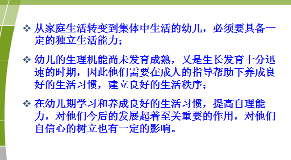 3. 了解生活活动在幼儿园教育活动中的重要意义,掌握幼儿园生活活动的目标。