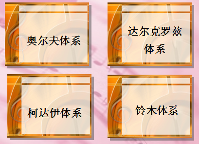 奥尔夫体系中的课程内容主要包括嗓音造型、动作造型和声音造型三个方面。声音造型即指乐器演奏活动。他主张把音乐、语言和动作的节奏结合起来训练,培养儿童的节奏感。