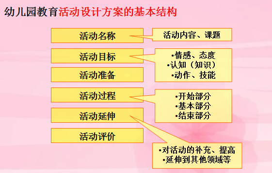 幼儿园教育活动设计方案的一般结构通常由活动名称、活动目标、活动准备、活动过程、活动延伸、活动评价这六部分组成。