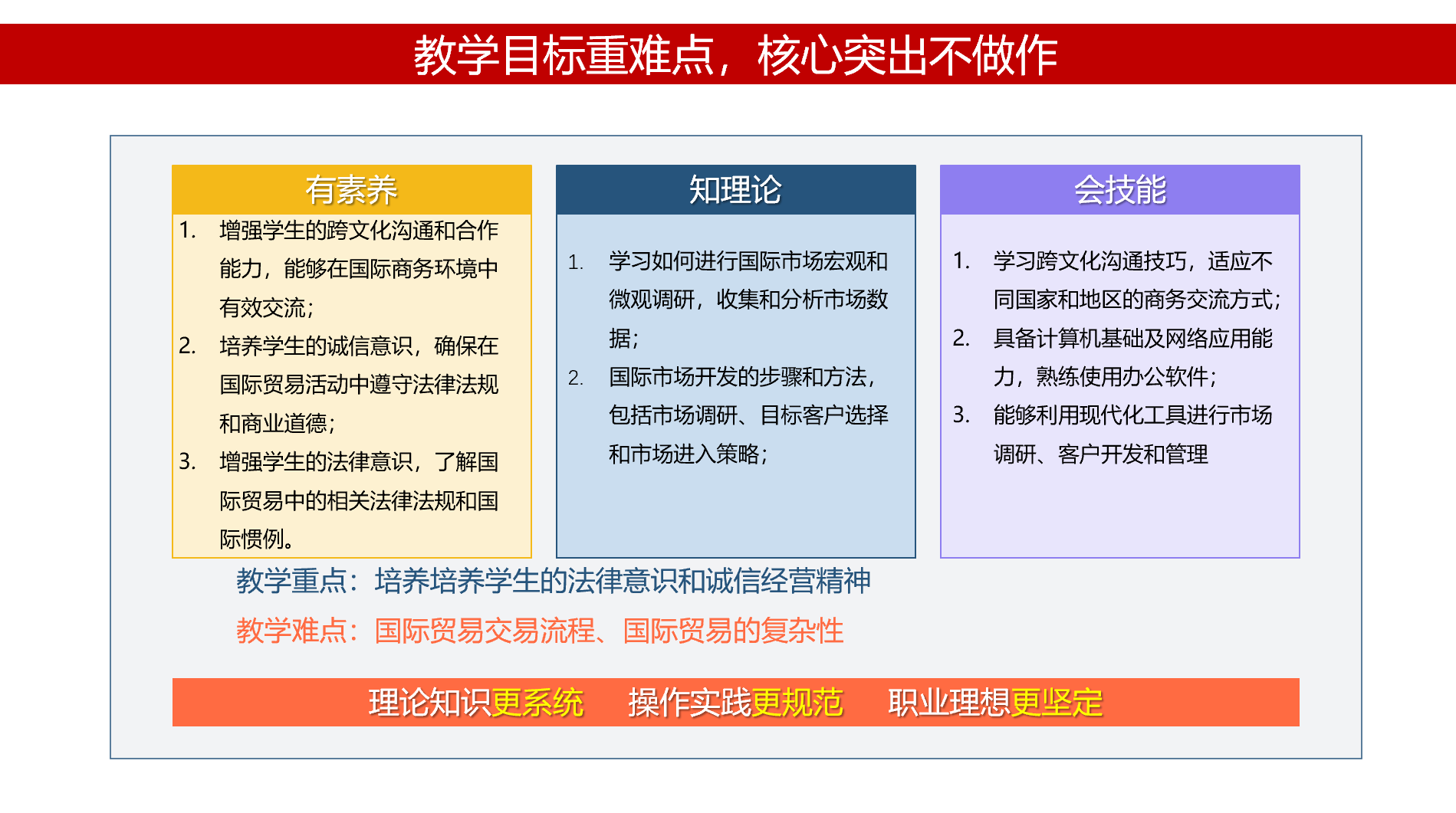 2.培养学生的诚信意识,确保在国际贸易活动中遵守法律法规和商业道德;