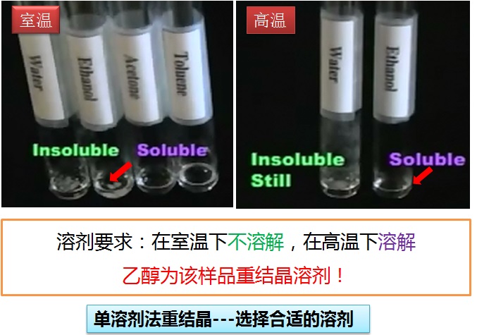 合适的溶剂是在室温下样品溶解度小,在高温(沸点)时溶解度大。