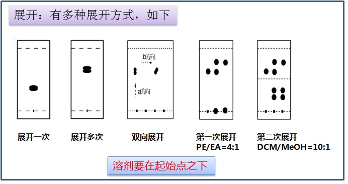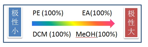 常用展开剂极性大小:石油醚<二氯甲烷<乙醚<四氢呋喃<乙酸乙酯<丙酮<正丙醇<甲醇<水