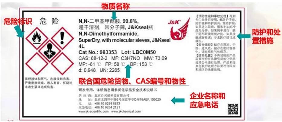 每瓶正规化学试剂都有规范的标签,主要包含药品名称、物理性质、货号、企业厂家,和药品的危险标识,防护措施。