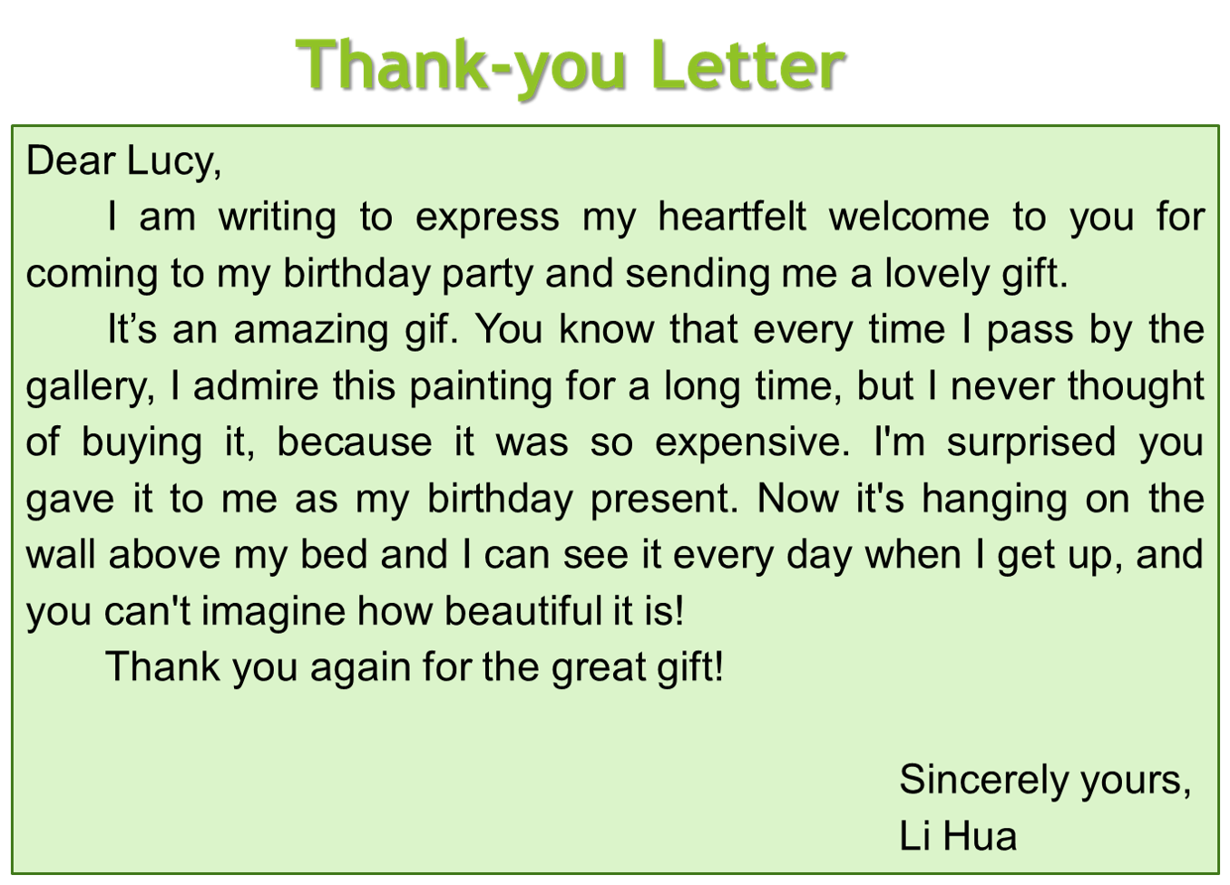 ⑥I am writing to show my sincere appreciation to sb. for sth. 我写信是为了表达我对……真诚的谢意。