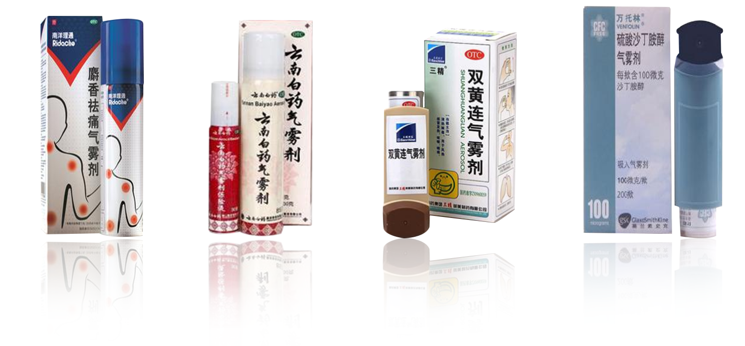 系指含药物溶液、乳浊液或药物提取物、饮片细粉与适宜抛射剂共同封装于具特制阀门系统的耐压容器中,使用时借助抛射剂的压力将内容物喷出呈雾状、泡沫状或其他形态的制剂。如,沙丁胺醇气雾剂,云南白药气雾剂、冰栀伤痛气雾剂、麝香祛痛气雾剂等。
