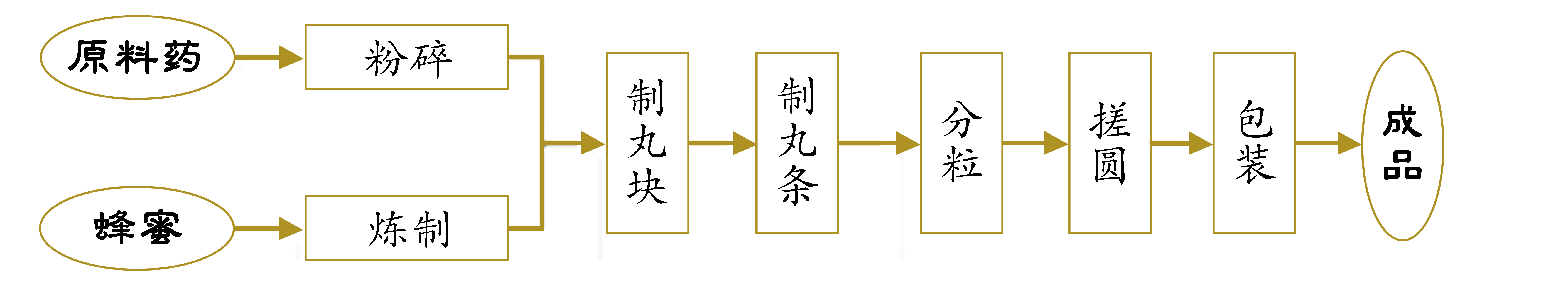 老蜜 温度达到119℃~122℃,含水量在10%以下,密度为1. 40 左右,手捻之甚黏,当两手指分开出现长白丝,滴入水中成珠状即可。老蜜粘合力很强,适合于含多量纤维质以及粘性差的矿物质制丸。