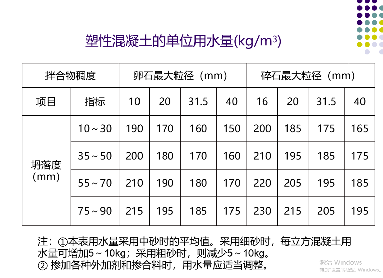 塑性混凝土的单位用水量(kg/m3)