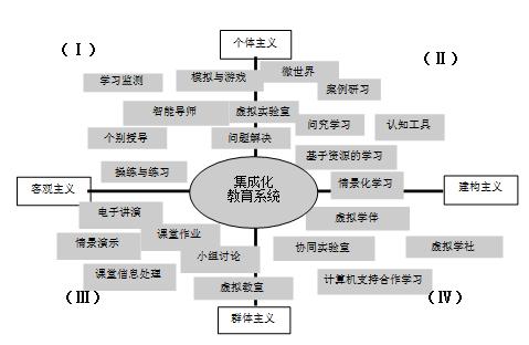 从哲学观角度考虑信息化教学模式取向。能从总体上了解信息化教育的概况和发展趋向。传统的CAI模式主要集中在I区,强调个别化教学,从传统的以教师为中心转换 为教为中心(国为教师的直接教学任务被机器所替代)。到了20世纪80年代模式的研究兴趣转移到II区,强调以学中心。90年代以后,由于网上教育的兴起,出现了以合作学习为中心的多种虚拟学习环境(IV区)。位于III区的教学模式是从传统的电化教室发展而来的,增加了多媒体教学,而虚拟教室的出现则大大扩展了其概念。位于中心的是集成化教育系统,指综合了许多不同信息化教学模式的系统。