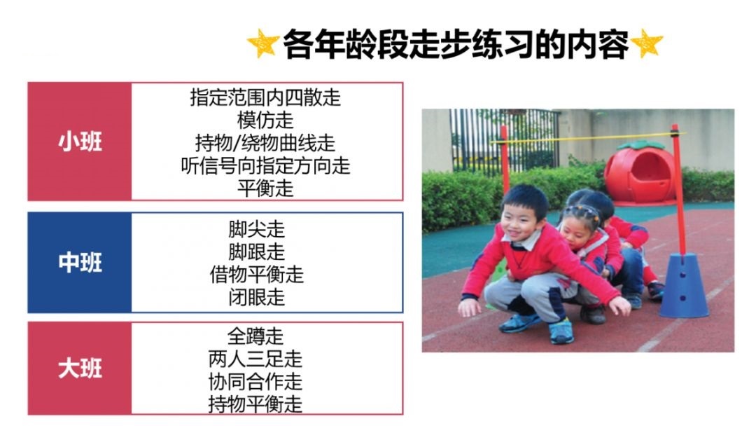 例如,不同年龄段幼儿关于走步的目标和练习内容是有所区别的,我们在设计游戏时应做到心中有数。