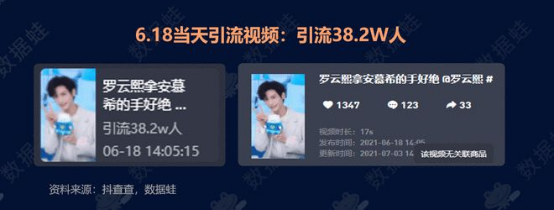 并且在6.18直播当天,下午2点的时候,发布了一条视频成功带来了流量38.2W人。