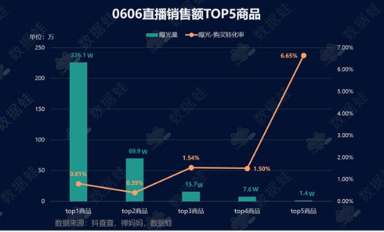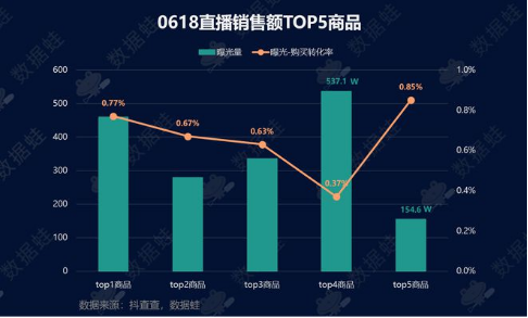 另外,我们看下618当天的TOP5销售额产品,发现有个产品曝光-购买转化率在0.85%,比TOP1商品还高0.08%,但是在流量上只有154.6万,不足top1的30%,在以后的直播选品上可以进行调整。
