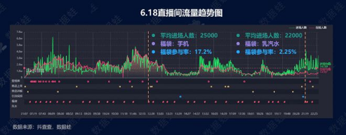 我们发现在晚上8点到10点之间,直播间进场流量加大,平均进场人数达到2.2W;但是在线人数在6500左右,没有明显提升