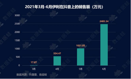 我们选择“伊利”这个品牌作为案例进行分析,在短短的4个月里,从最初每月营收17.07万,到6月份达到了2485.54 万,伊利的牛奶,有点牛!