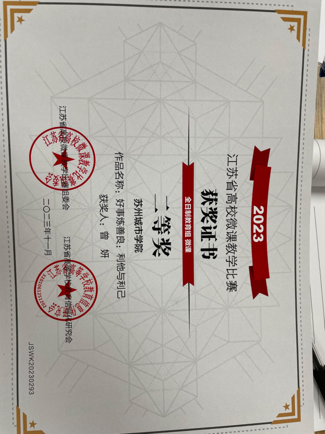 • 8.1 2023年11月曾妍老师微课省级获奖