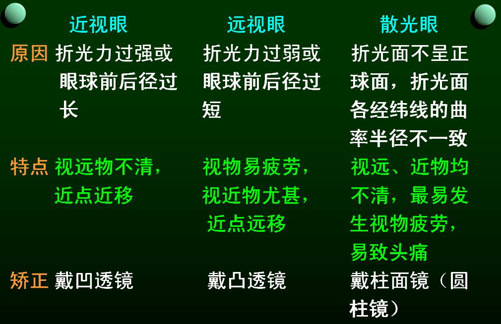 (8)老视:静息时折光能力正常,但由于晶状体的弹性减弱或丧失,看近物时的调节能力减弱,戴凸透镜矫正。