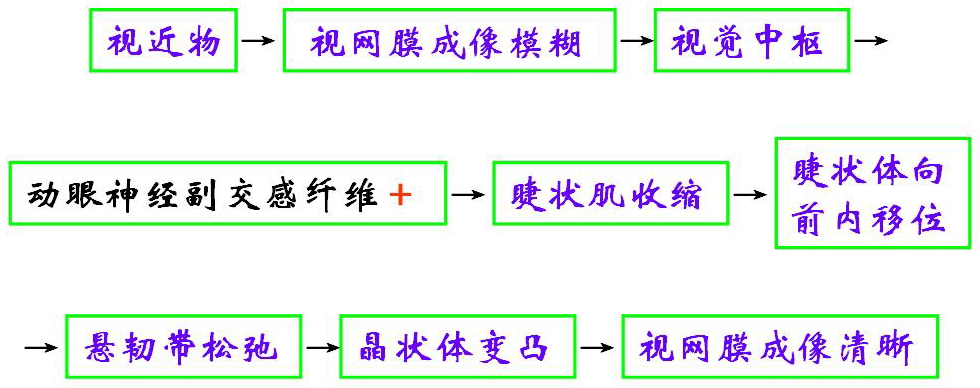 (1)眼的调节的概念:指眼睛看清近物的调节过程,通过调节反射实现。