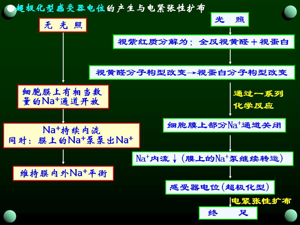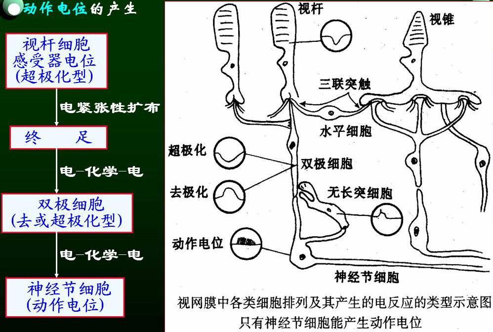 (5)视杆细胞的感受器电位:从-30mV转变成为-60mV的超极化型感受器电位,了解其产生的机制。