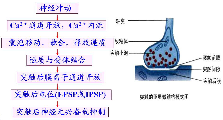 当神经冲动到达轴突末梢,引起突触前膜去极化,前膜对Ca2+通透性增大,于是Ca2+内流进入突触小体,促使其内的递质囊泡向前膜靠近,然后融合,破裂并释放递质。递质经弥散到达突触后膜,并与后膜上的特殊受体相结合,改变突触后膜对离子的通透性,使突触后膜产生局部去极化电位或超极化电位,这两种性质不同的突触后电位分别与突触后神经元发生兴奋或抑制有关。这种突触后膜上的电位变化称为突触后电位,它分为兴奋性突触后电位和抑制性突触后电位两种。