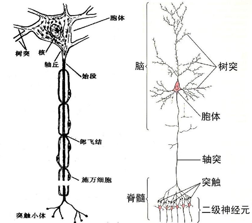 神经元是神经系统基本的结构与功能单位。神经元的结构大致可分为细胞体和突起,突起又分树突和轴突两种。轴突又称神经纤维。