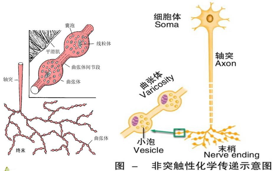 新近实验观察到,神经元间的化学性传递除可在经典突触处进行外,还可在轴突末梢的分支上进行。例如,在交感神经肾上腺素能神经元轴突末梢的分支上,有大量的念珠状曲张体,内含大量递质囊泡。当神经冲动到达曲张体时,引起递质释放。递质经弥散到达附近的效应细胞,经与膜受体结合发挥作用。由于这种化学性传递是不通过经典突触进行的,因此,称为非突触性化学传递。非突触性化学传递的特点是:①不存在突触前膜及后膜的结构;②不存在一对一的支配关系,一个曲张体可支配多个效应细胞;③曲张体与效应细胞的间距较大,递质弥散距离远;④传递时间长于1s;⑤递质对效应细胞的影响取决于后者有无相应受体。